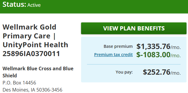 I currently “pay” $253/mo for an ACA gold plan. I’m in Des Moines and my plan specifically requires the Unitypoint network (which is huge). What I actually end up paying is determined when I do my taxes next year and reconcile the amount.
