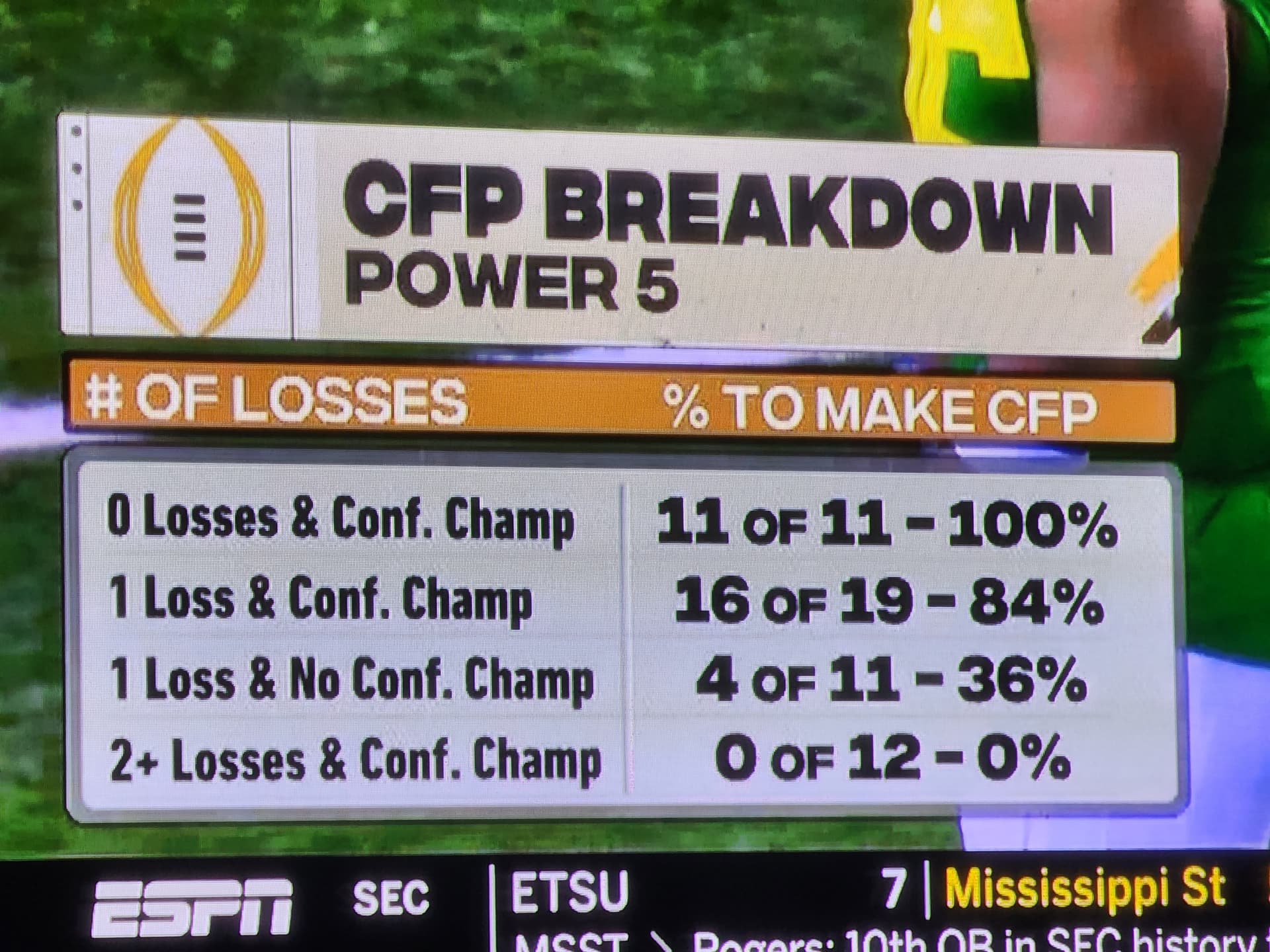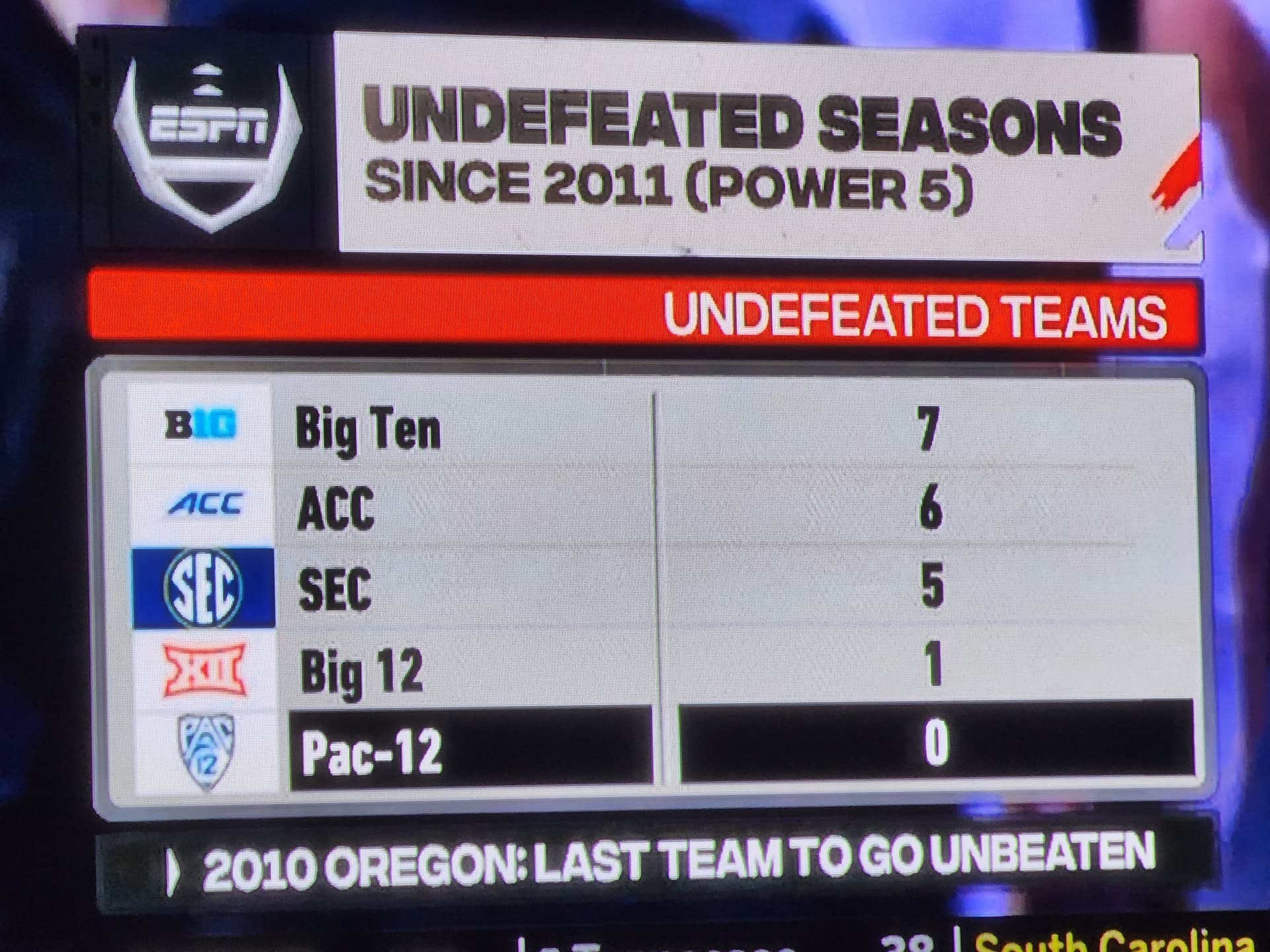 I saw these 2 graphics during the USC/UCLA game. Interesting breakdown. They were talking about how the PAC12 was so tough that they never managed to have any undefeated teams and that was why they had not been represented as well in the CFP.