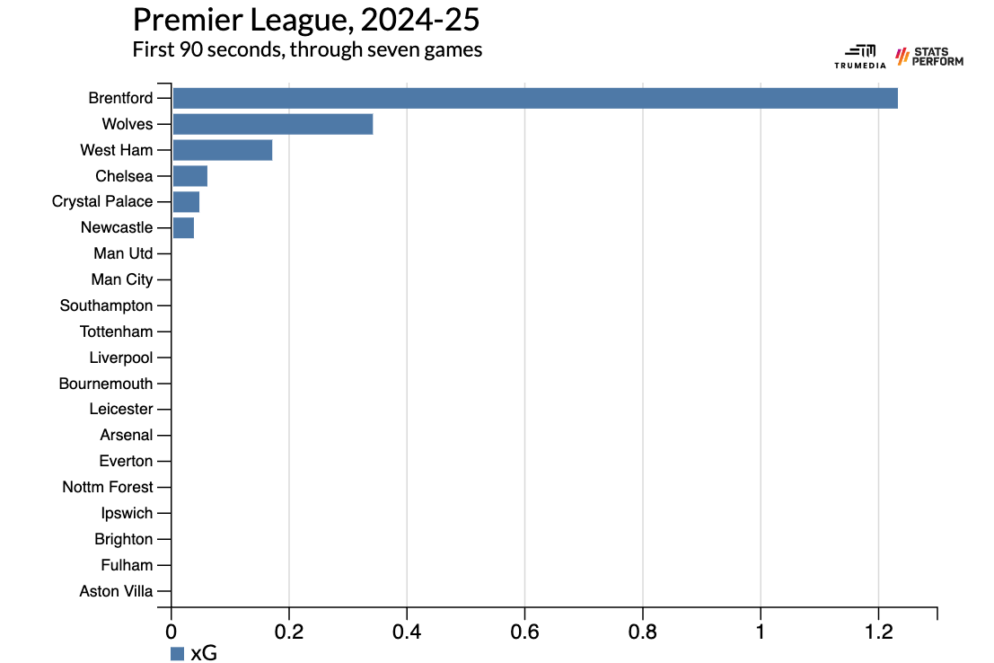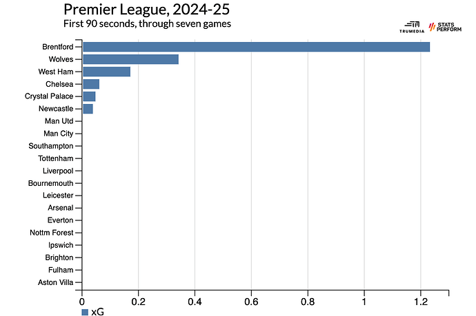 The average team has created 0.1 xG in the first 90 seconds of their games through seven matches. Brentford are more than a full goal ahead of that. Across a full season, that would be about six goals more than the average team. And when you consider that a goal is roughly equivalent to one point, so theyâd be gaining six points on the field. Given how detail oriented and obsessive most Premier League managers are, isnât it kind of mind-boggling that no one else is doing this? What coach wouldnât kill for an extra two wins per season? Apparently, almost all of them.
