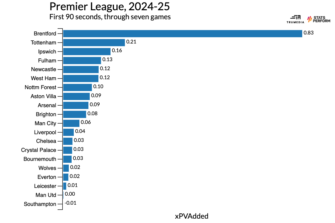 A failed pass into the opposition box will still likely generate positive value, while the opposite would happen from a long pass backward. Across the first 90 seconds of seven games this season, Brentford have created nearly a full goal of possession value. No one else in the league is anywhere close: