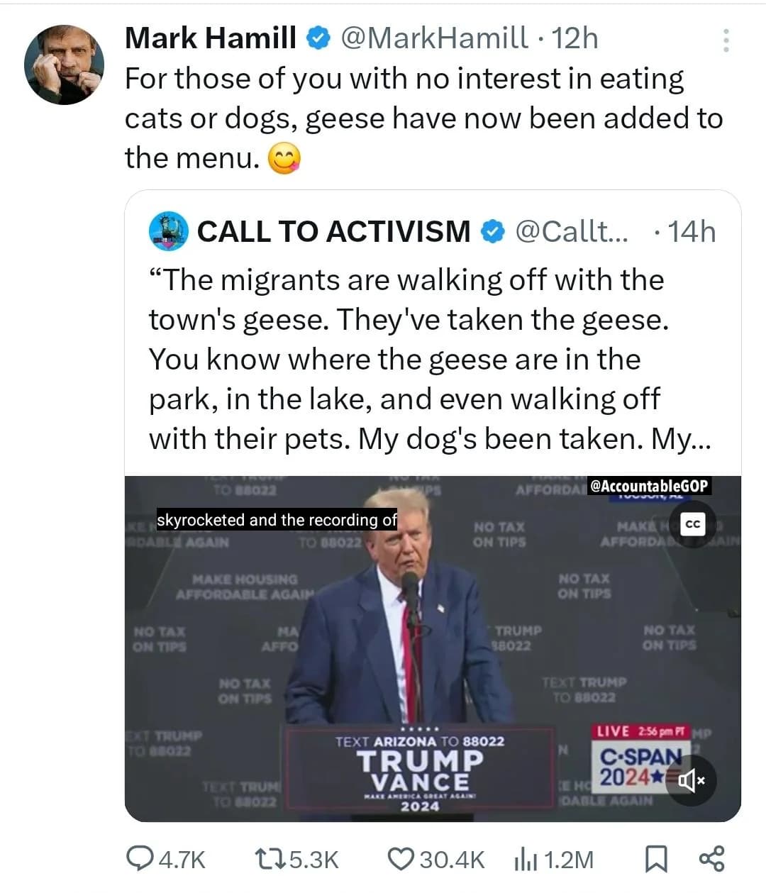 And if Swift’s benign endorsement actually moderates the viewpoint of a few MAGA Swifties… even better. Even if it only moves the needle for some fans from “voting for Trump and willing to participate in violent coup” to “voting for Trump but unwilling to participate in violent coup” then that’s still a net positive for the world.