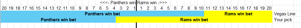 You spent fourteen points to change 14 blue boxes to yellow boxes, meaning the Rams now win if they win or lose by 3 or less, instead of only winning if they win by 11 or more. (just realized there is technically a 0 box that I forgot — pretend it is there.