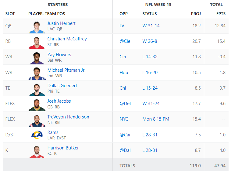 It was looking bleak for me this week with Lamb, London, Harrison, and Pitts all hurt. I lucked out that another guy also underperformed, putting me in the BYE for round 1 of the playoffs this week. Hopefully I get at least half of those guys back.