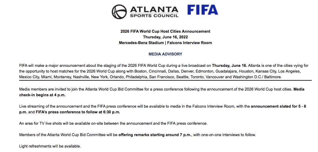 I already thought ATL was a lock as a host, but scheduling a press conference at the stadium for the FIFA broadcast makes it seem even more so.
