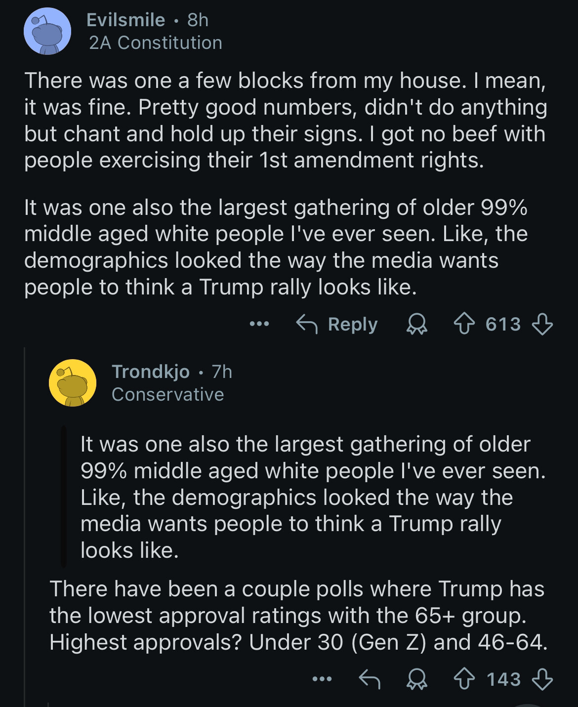 This is just a small sample, but it seems like the new talking point is “only old women are getting upset, not Real Americans”.