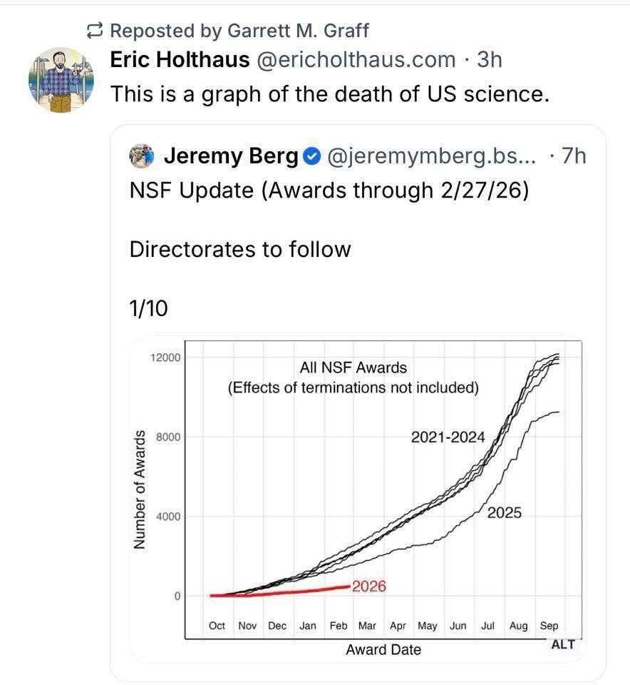 I heard that a conference I’ve attended a couple of times is being cancelled this year and being permanently moved to a biennial cycle. Next meeting will be in France. Seems like it’s due to a combination of lack of research funding and non-US scientists not wanting to come to the US for conferences.
