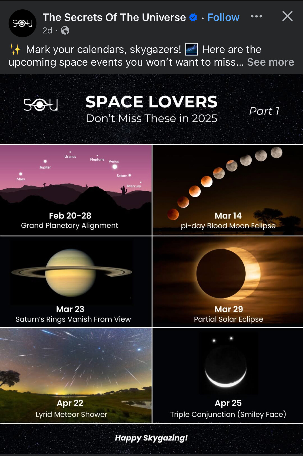 On March 23, Saturn’s tilt aligns with Earth’s, making the thin rings appear to be nearly invisible. This will be the narrowest you’ll see the rings in 2025, and without equipment you probably won’t be able to see it.