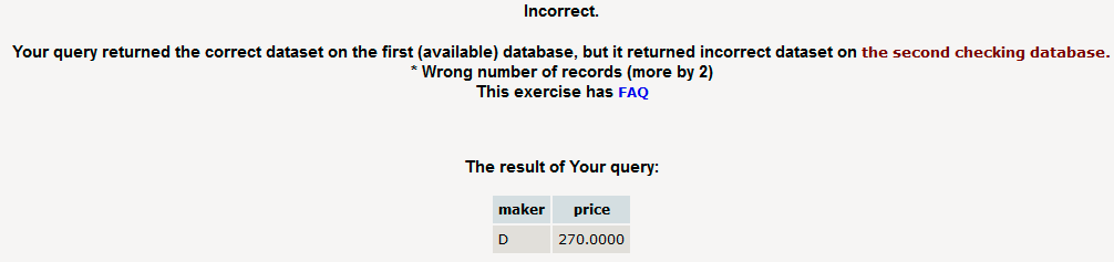 OK, I am confused by the question. Makers of the cheapest color printers? Sounds like they expect more than 1. If the instruction is “find the lowest price for a color printer, and list all makers that have a color printer at that price” I might have phrased it as “…Maker(s) of the cheapest color printer(s)”.
