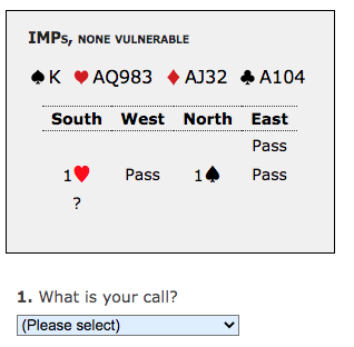 1B Three diamonds. Game is still unlikely, but vul at imps we’ve got to take a shot at it. Chances of going down in 4C are low, and if partner bids game (3NT or 5C) its odds likely exceed the imp threshold. Biggest concern is that 5C may be the better game even if partner bids 3NT now. That’s so likely that if he bids 3NT I’ll retreat to 4C, hopefully (on this hand) nonforcing so that he’ll devalue heart honors except the ace. He would then think Qx of spades is great, but can’t have everything.