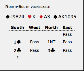 I think imps is easier. Vul at imps, it’s worth taking a shot at game, at that shot should be 5C. Too unlikely we could intelligently choose 3NT anyway.