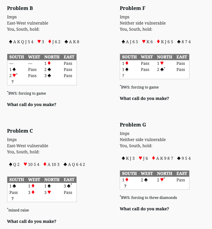 A) 2H. Steve thought 3H was “very normal” and Abstract Actuary thought 2D was “straightforward”. If partner has another bid I’ll show my spades of course. It is a nice 5-loser hand and I am chomping at the bit to get to game, but no guarantee partner has working cards yet.