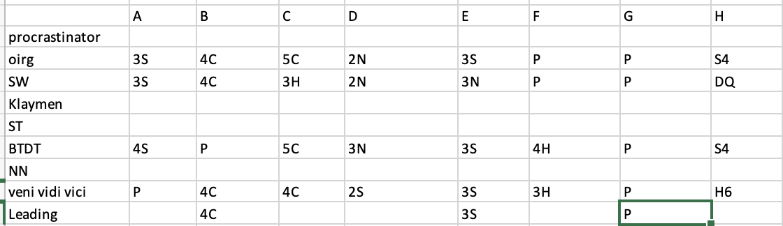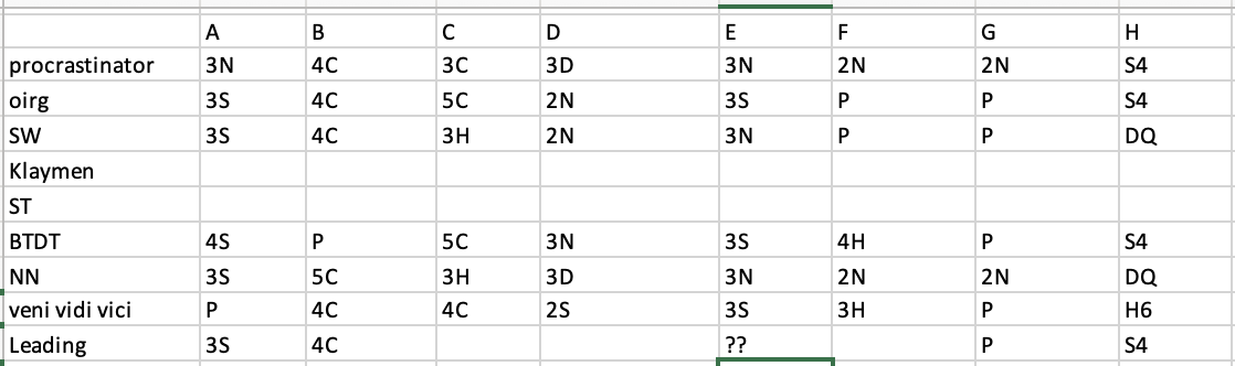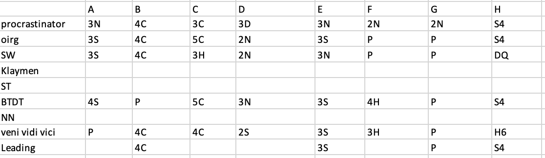 | SW | 3S | 4C | 3H | 2N | 3N | P | P | DQ |
