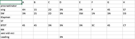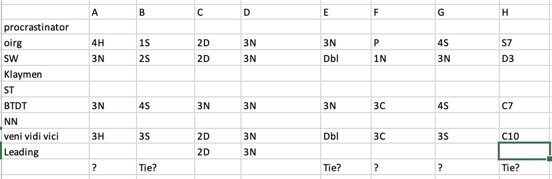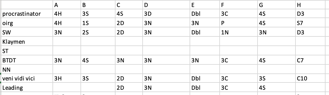| SW | 3N | 2S | 2D | 3N | Dbl | 1N | 3N | D3 |