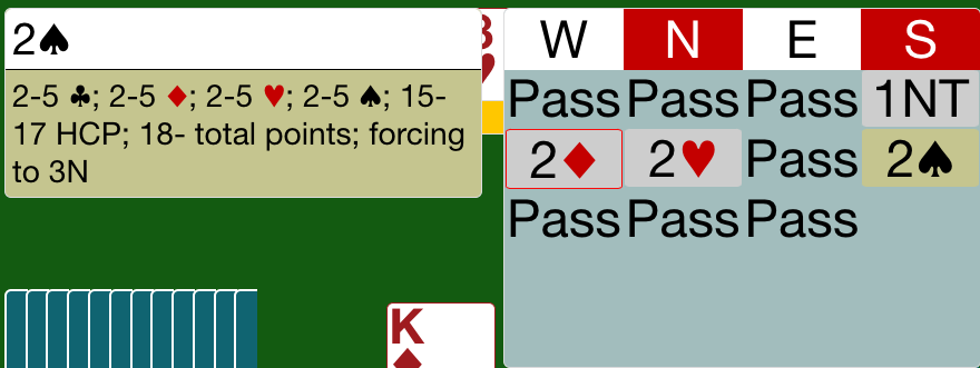 So we’re in a game forcing auction, West showed both majors, he has 3 small spades, I haven’t shown spades, and he leaves me in 2S???
