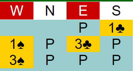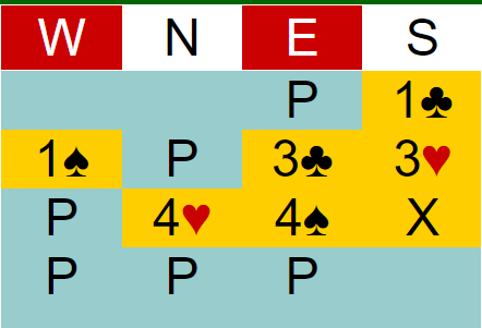 Who knows what’s best? Clubs is certainly an OK fit. Partner might have spades, but might not. System notes say my choice, 4S, shows 13+ HCP and denies 4 clubs (and has strong rebiddable spades, which despite 7 these may not be). They also say the procrastinator’s 5C shows 13+ HCP with 3 or 4 clubs. Obviously we are well short of 13 HCP, but should we pass? [System notes don’t think much of sacrifices.]