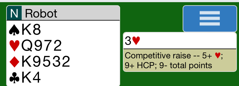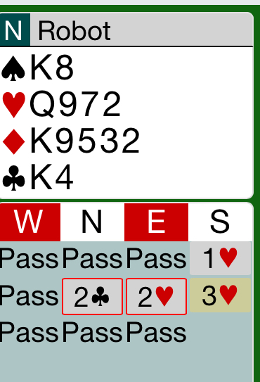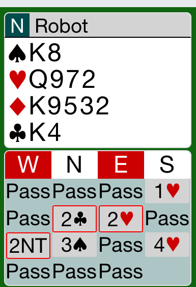 CHO’s 2C was Drury, promising at least 3 hearts and roughly 10-12 total points, so I shouldn’t have much more than 13 (else I should have bid 4 heats).