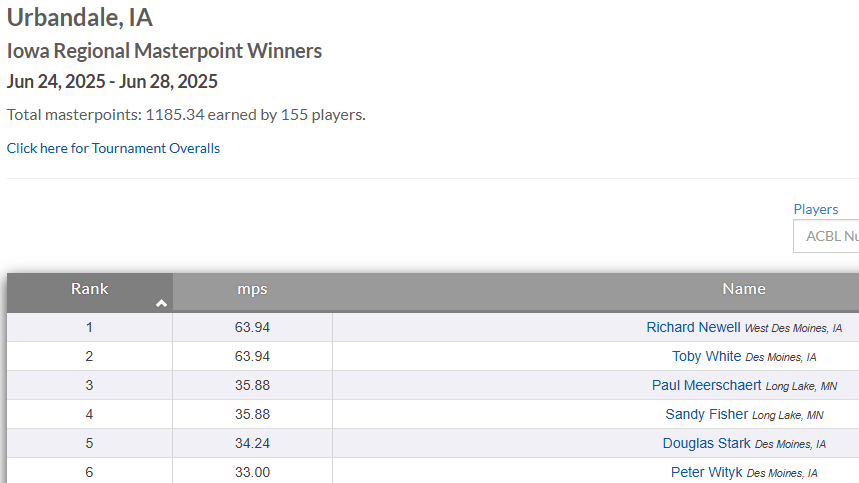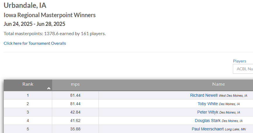 Our small regional tournament is only every two years. Tomorrow we will be the masterpoint winners for the second time in a row (helps that there’s no pros anywhere to be found, one pro/client barely edged us out the time before)
