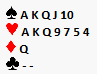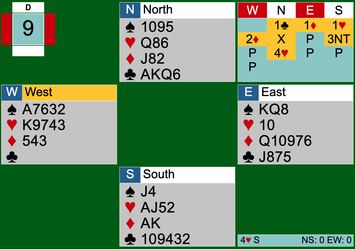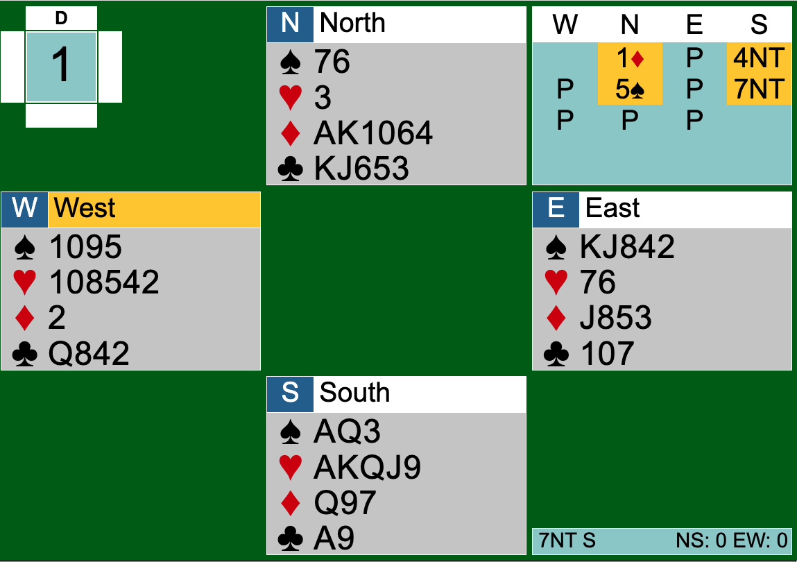 I expected it to be a laydown. 4S showed 2 keys with the diamond Q, and since he couldn’t have the diamond Q and didn’t (as far as I know) know I had diamond support, I figured he had to have 6 diamonds if not 7. Nope, only 5. Still shouldn’t be enough extra length to show the Q even if I had promised support. Wouldn’t have been too bad if I could pick up the diamonds, but I couldn’t. Fortunately E, not knowing my heart length, pitched one, and with both black finesses working the contract came home. (Board played 7 times. My result tied for top, with another on same auction. 2 went down in 7NT after responding 1H to 1D. They each reached 7NT without knowing about the diamond K, since when they used blackwood it was key cards for clubs.)