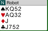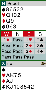 EATA: Lost to NN by 17. Would have lost anyway, but very annoyed to lose 7 imps to NN on a hand where I thought I understood bots’ methods, totally different than what I think they should be. 1S by LHO - Dbl by CHO - Rdbl by RHO - ?