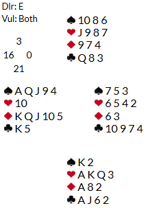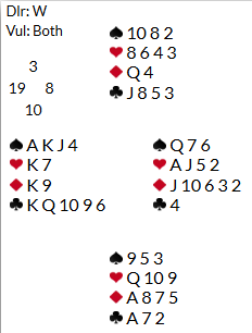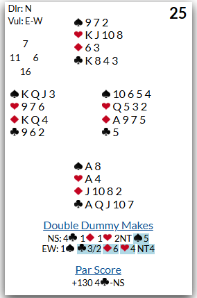 Toby opened 1C (our 1NT here is 10-11) Mike Cappelletti Jr bid 1S, Neg X, and now a 2N call that shows spades. Toby bid 3D, Mike bid 3S and I raised to 4C. Mike doubled that and Toby scored up +510 and a pure top.