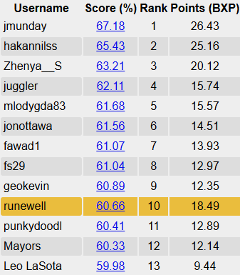 I played, even though I’ve been too busy for most of them recently. NN won with 55%, but since total scores of the 3 who finished were only 139.59 (where 4 scores would add to 200), procrastinator had a lead had he finished. In fact, since he played 15 of the 16 boards, he was probably certain to win even if he got a 0 on board 16.