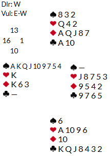 Board 8 of the current Declare-only. Don’t know whether I played it well or not. Not optimally, I think, as the cards lie. But regardless of the play, this has got to be some of the worst bot bidding ever. With Board 2 also a candidate for worst bidding ever. Board 5 is awful Bot bidding, but not as bad as 2 or 8.