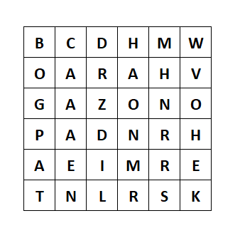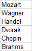 Start at the top and choose one letter from each successive row to form the last names of six 6-letter composers. You may jump to any column as you go down. There is never a need to rearrange the letters, and every letter will be used exactly once. Who are the six composers?