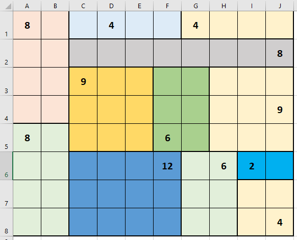 Subdivide this region along the grid lines into non-overlapping squares and rectangles. Each rectangle or square must contain exactly one number that indicates how many cells make up its area.