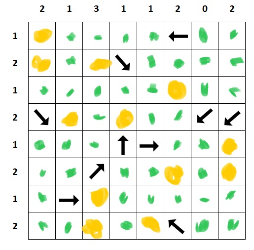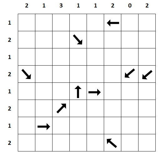 Locate hidden treasures in 12 of the empty cells of this grid. The numbers outside the grid indicate how many treasures there are in each row or column. Each arrow points directly toward one or more of the treasures. An arrow may be immediately next to a treasure it points to, or it may be farther away. Not every treasure will necessarily have an arrow pointing to it. Can you locate the 12 treasures?