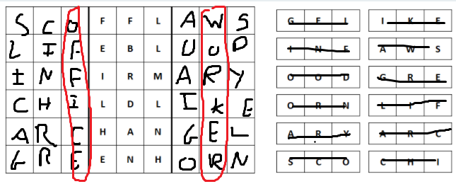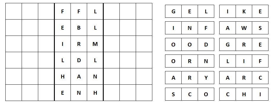 Form six 9-letter words by combining two of the three-letter blocks shown below (right) with each middle block in the grid. All blocks will be used. If you do it correctly, two of the vertical columns will spell a common two-word phrase.