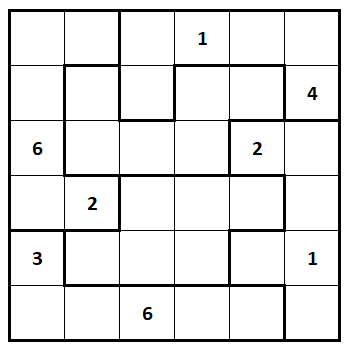 Fill in each empty cell of this grid with a number 1 through 6 so that each row, each column, and each outlined region contains six different numbers. Can you finish the grid?