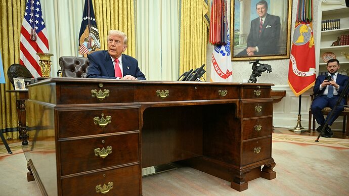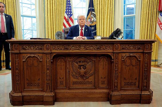 An article posted (above) 2/21/25 stated that tRump had removed the Booger Desk to get some refinishing.