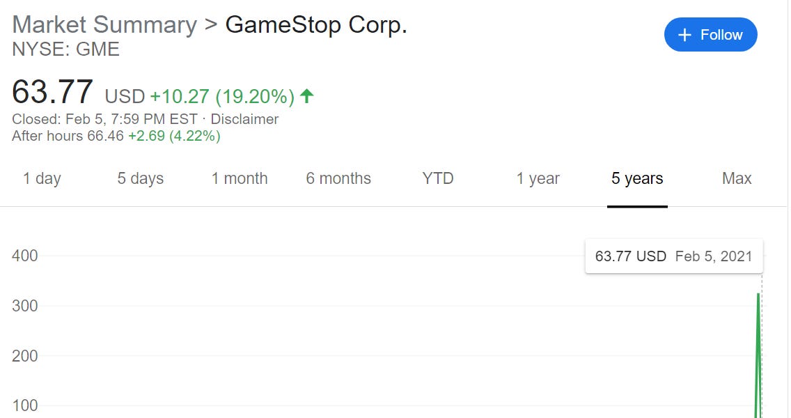 I’ll keep a thread for gathering up investment screwups on a big scale. The $GME thing is still ongoing - not to the moon, but still pretty high compared to earlier market price. Let’s see where this goes.