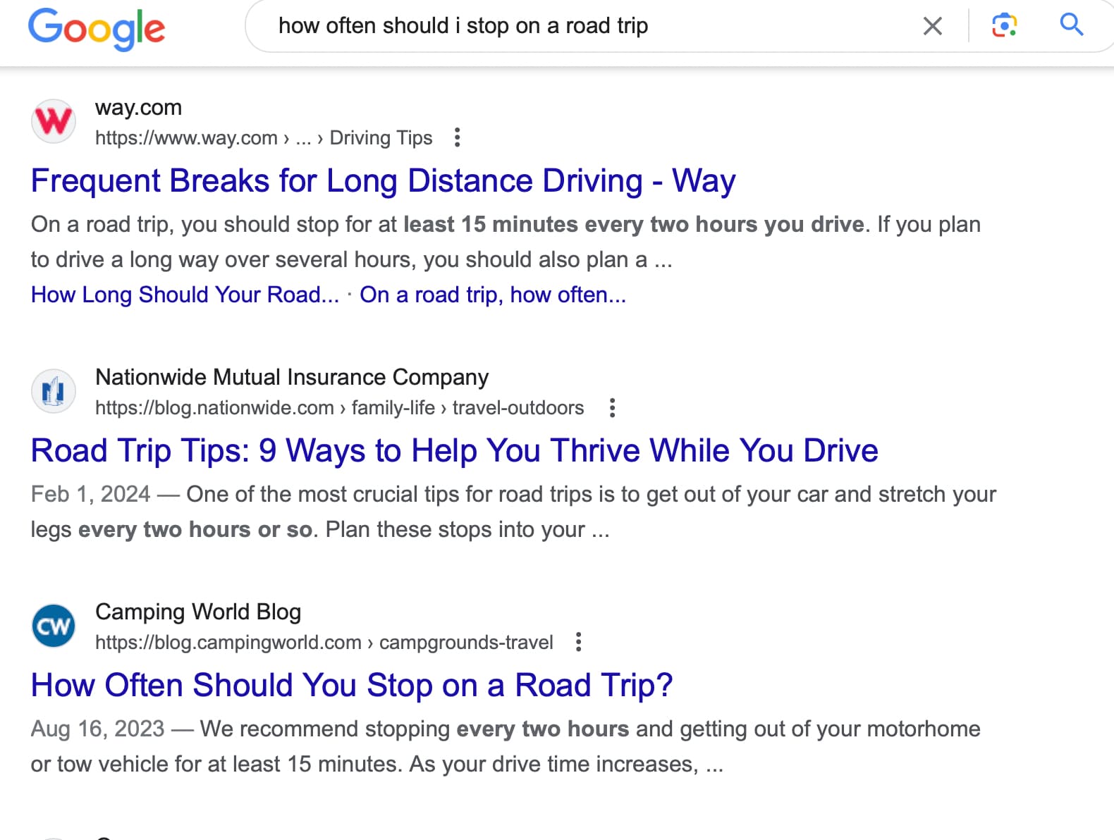 I just googled “how often should I stop on road trips” and the websites that came up recommended a 15 minute stop every two hours.