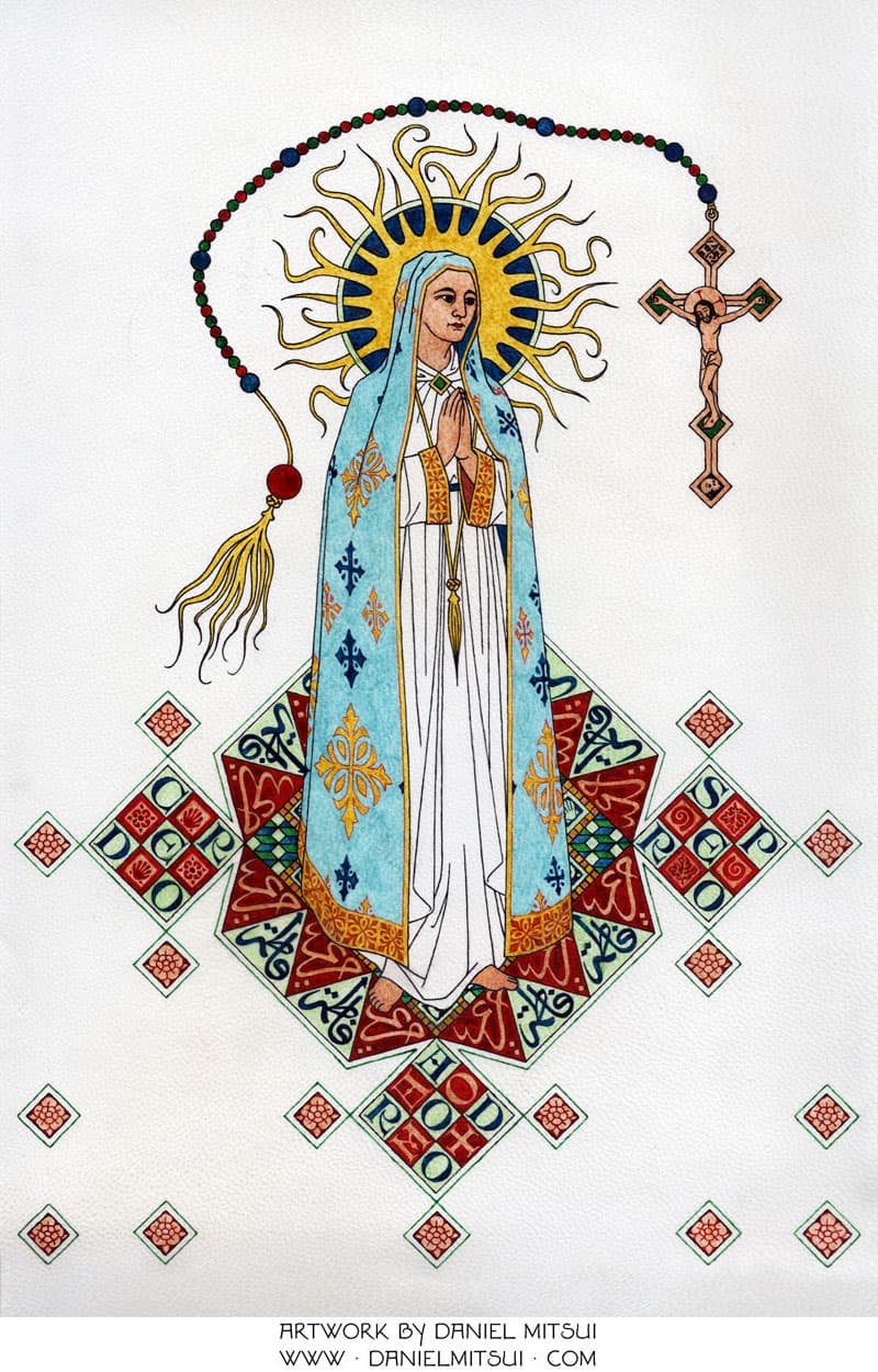 ](https://twitter.com/danielmitsuiart)Our Lady of Fatima was seen by three shepherd children in Portugal in 1917. I based this drawing loosely on the statue in the Chapel of the Apparitions. She has a rosary about her, indicating the request for daily rosary prayers.