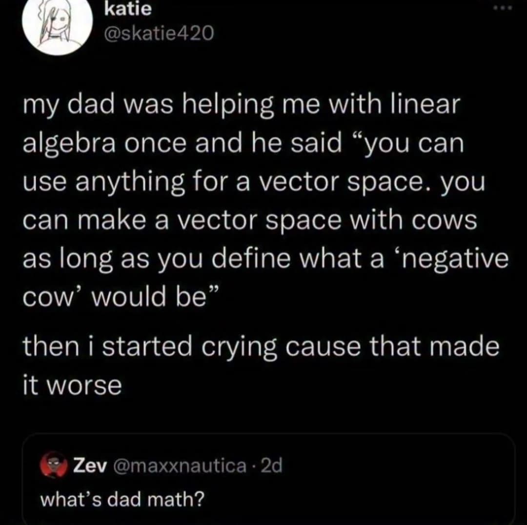 25 years ago, my wife was taking a Linear Algebra class, after undergrad as a prerequisite to an Accounting certificate. She sat down one Saturday morning to do the first homework assignment, I left to go do some chores. Came back three hours later to find her in the same position, book still open to Chapter 1, Page 1. I asked, “How’s it going?” She burst into tears, saying "I don’t even know what ‘permute’ means!"