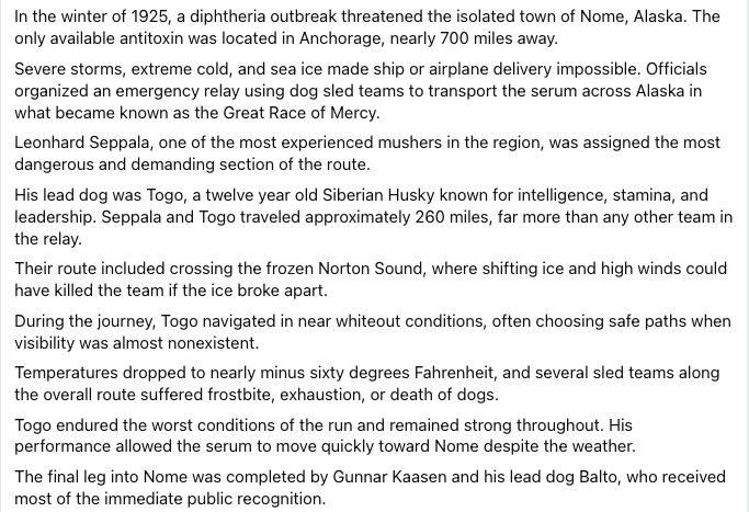 Balto was a hero, but not the biggest hero. tl/dr; (Another lead dog covered almost 5 times as great a distance, under greater danger.)