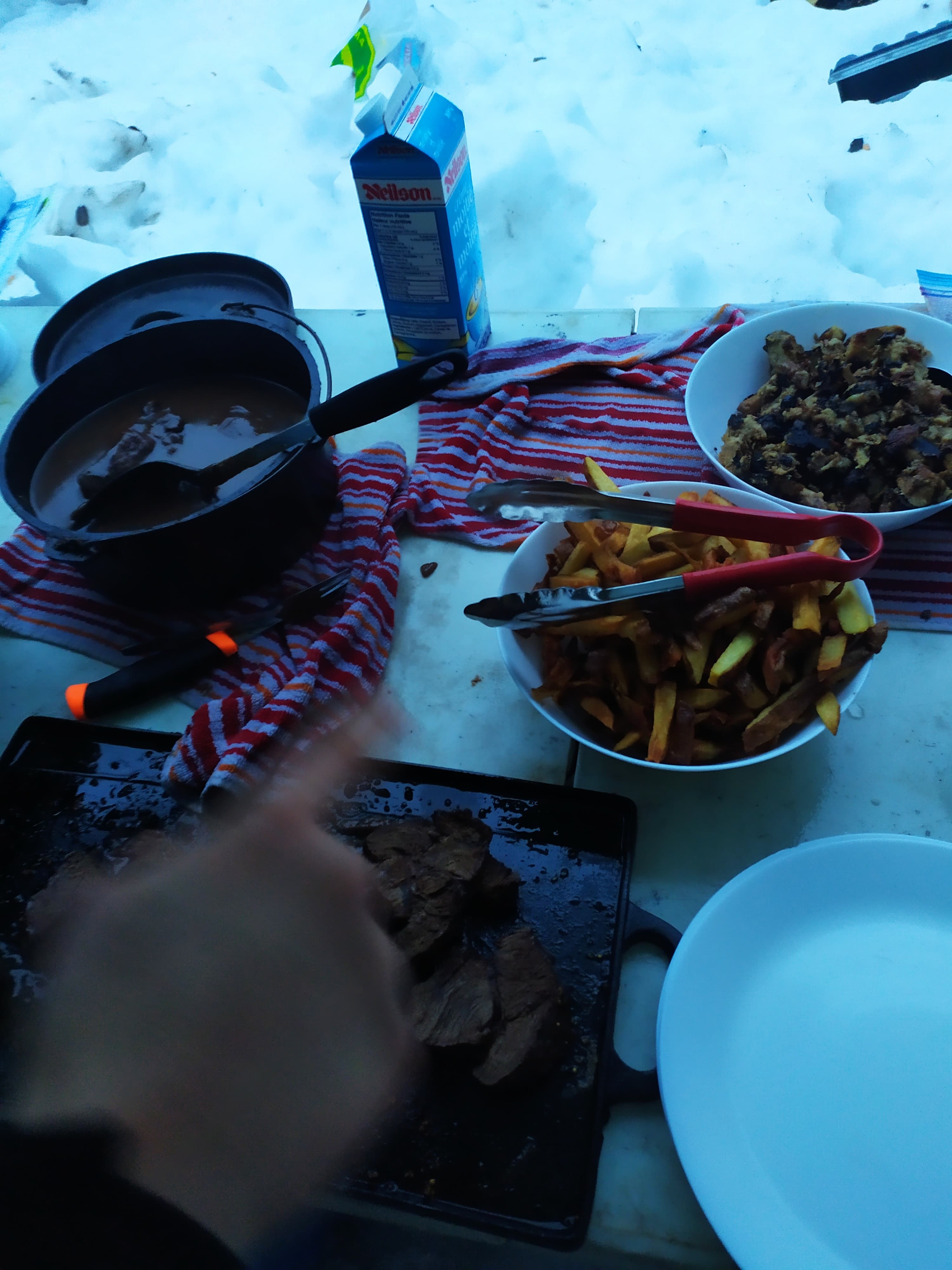In the bush camping with three international students right now. Three feet of snow and pouring rain. Students have gone shooting I’m back at camp making moose roast for dinner.