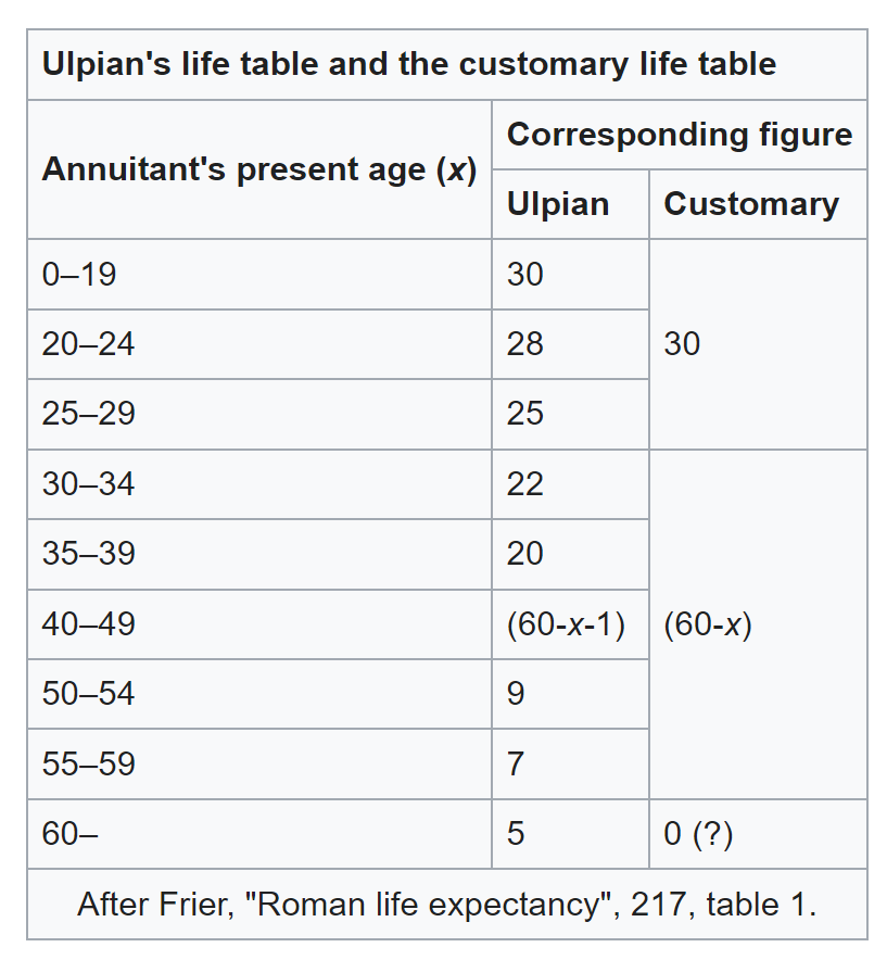 Ulpian’s life table is an ancient Roman annuities table. It is known through a passage, originating from the jurist Aemilius Macer, preserved in edited form in Justinian’s Digest. The table appears to provide a rough outline of ancient Roman life expectancy. Although it is not clear what population the table refers to, or how its data was gathered,[1] Richard Duncan-Jones has suggested that it refers to slaves and ex-slaves, who were often the object of testamentary maintenance grants.[2]