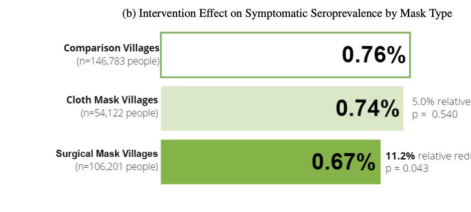 I only skimmed the study, but they had a significant effect on symptomatic covid. I can’t get it to paste in, but it’s figure 2. Cloth masks reduce symptomatic covid by 8.5% with p = 0.048 (and null hypothesis a zero effect i assume.)