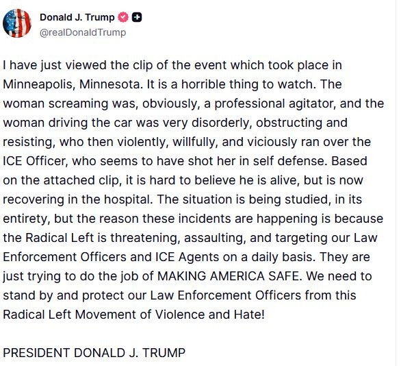 Trump and Noem making up pure bullshit terrorist nonsense to cover up their immigration soldier shooting a 37 year old mother point blank in the face and killing her really feels like a moment that should tell every American just how much this administration really cares about them.