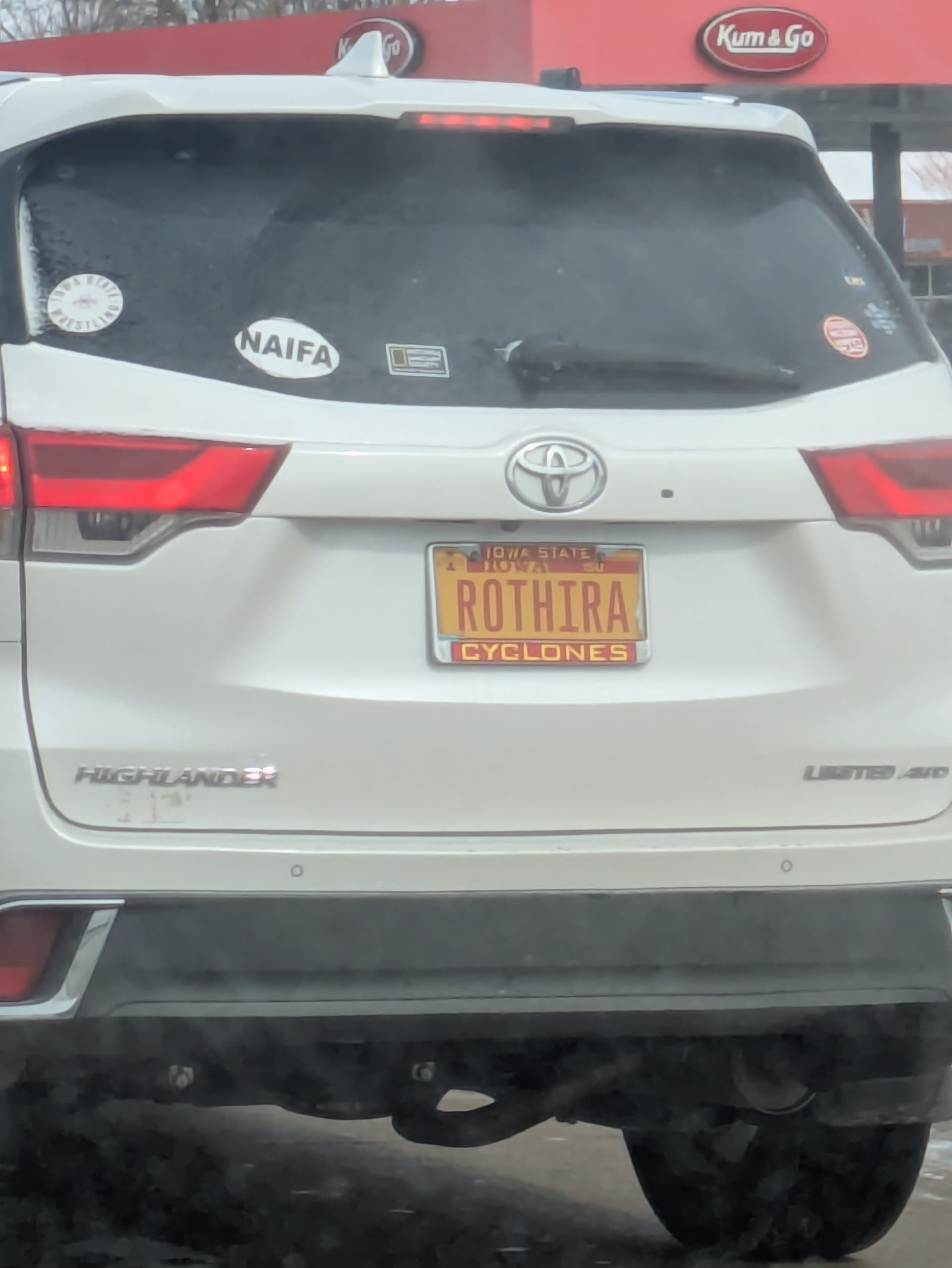A friend drives an Infiniti and has the license plate “N BYOND” and a Buzz Lightyear in her rear window.
