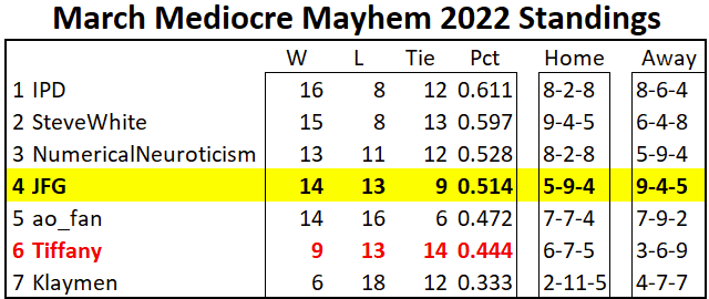 As a reminder, the goal is to win and lose such that you end up in the middle of the standings [or] throw what your opponent throws (a lot). Individual matches that end in a tie will be considered 1/2 of a win. The MMM will be based on overall standings.