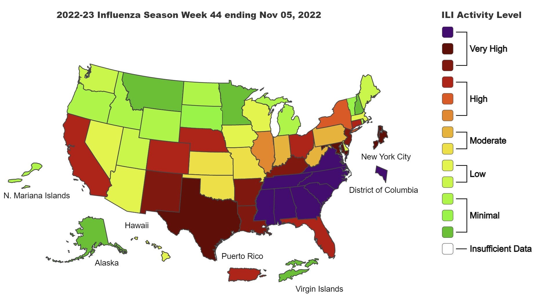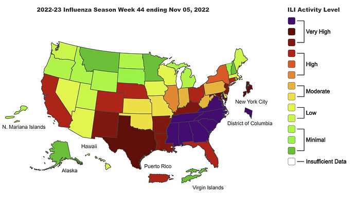 Scrolling through the CDC map website, I note that the pattern of the southeast looking ugly around this point in flu season seems to have been a thing even before COVID.