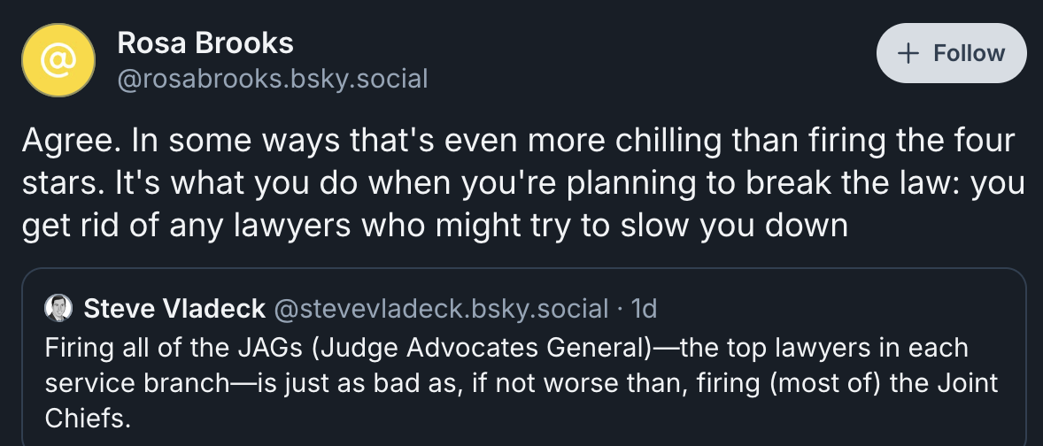 Hegseth’s response on Fox News this morning: We want lawyers who don’t exist or attempt to be roadblocks.