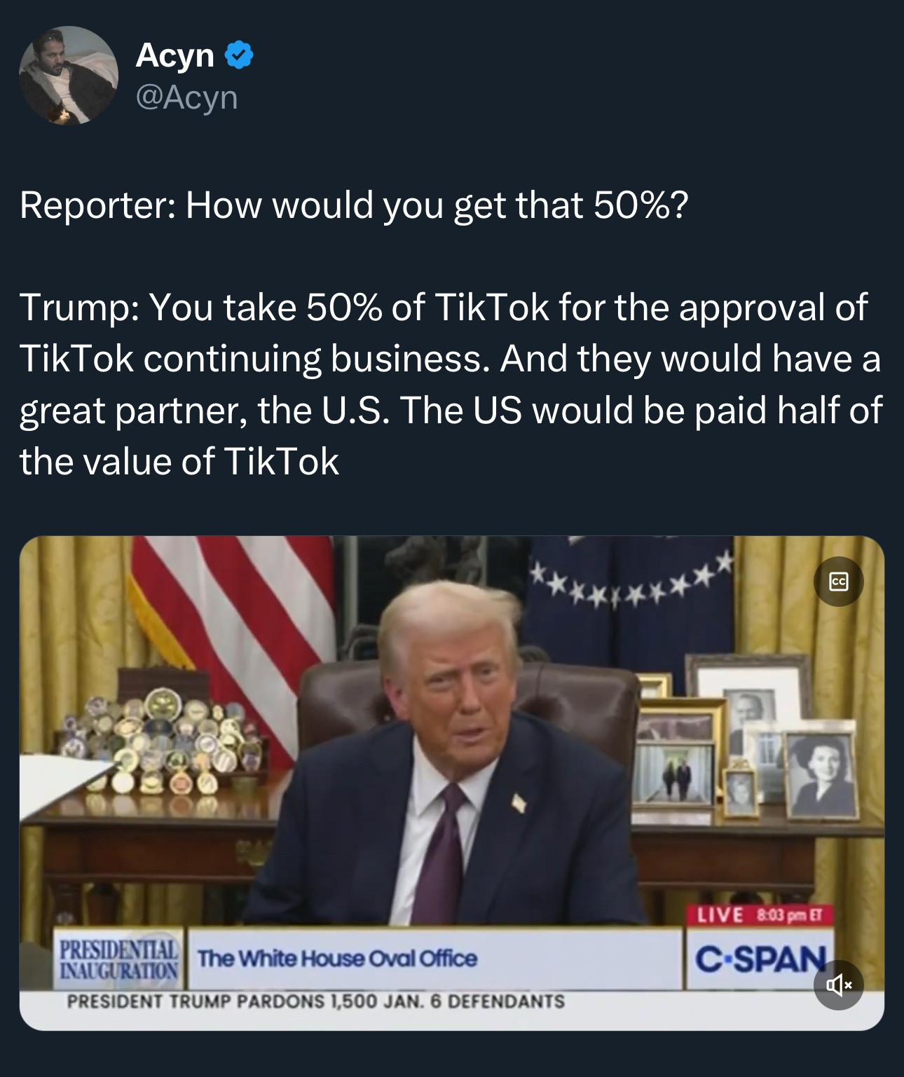 Congress voted that TikTok would have to shut down soon. TikTok suddenly shut down in advance of being required to leverage their addicted userbase, leaving a message that Tiktok needs Trump to save them. Yass gave a bribe to Trump (I mean, uh, made a wise investment in $Trump and/or $Melania and/or DJT), Trump gave TikTok an executive order, and TikTok opened with a big message thanking Trump.