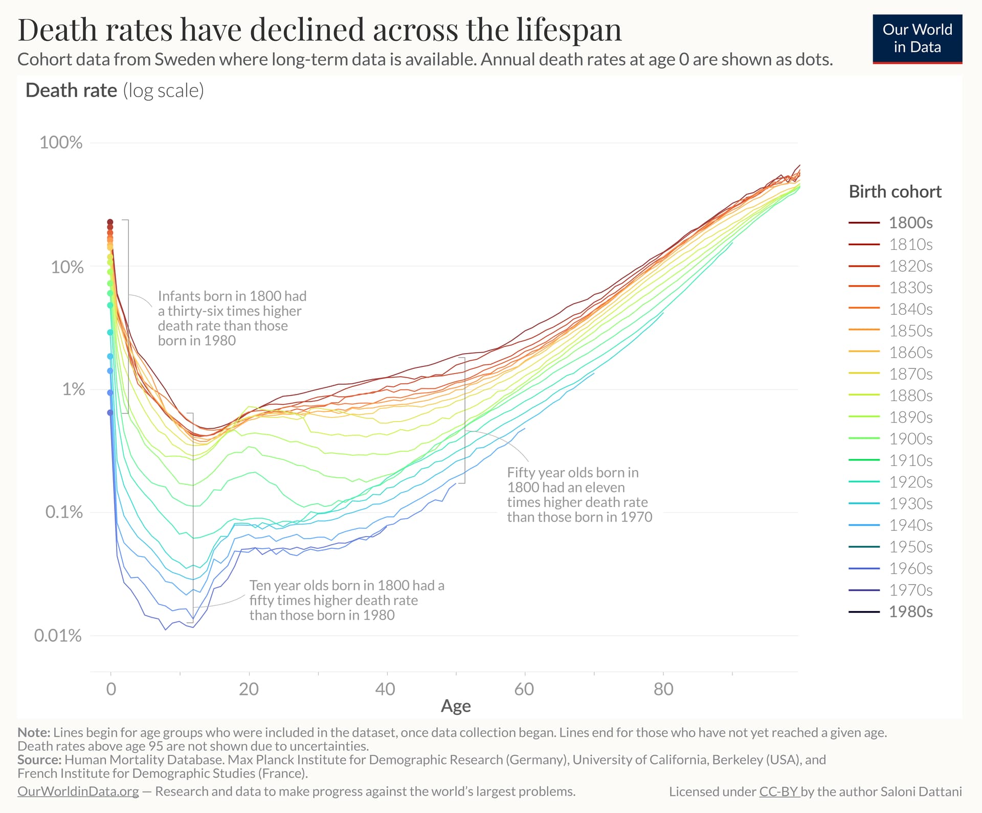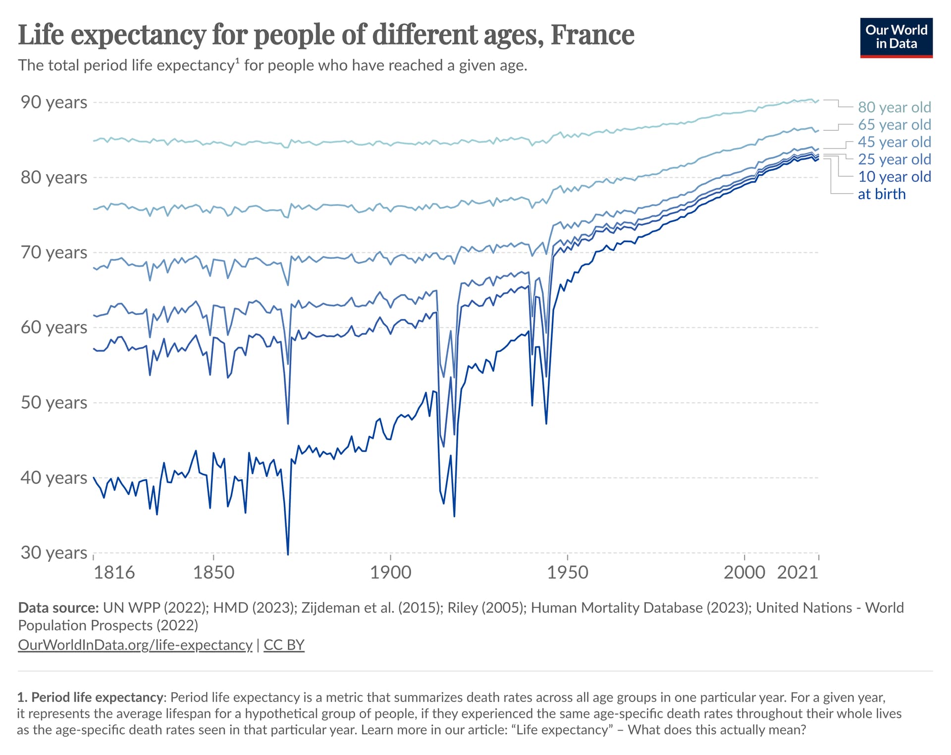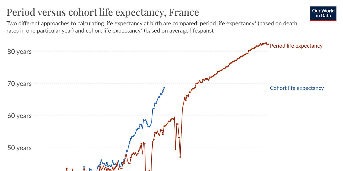 But can’t really see the 1918 Spanish flu pandemic nor COVID … though these are period life expectancies (as opposed to cohort).