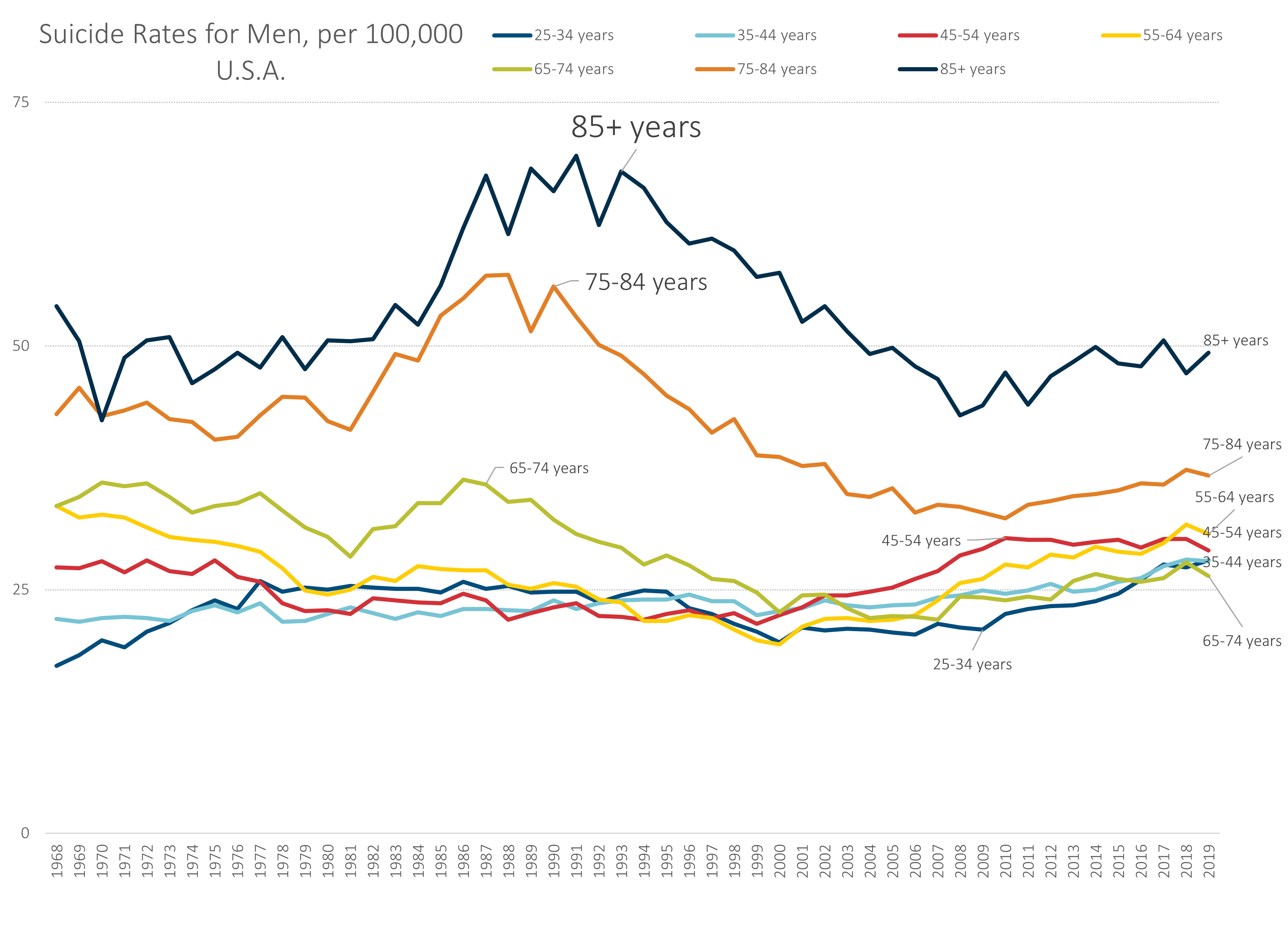 part of it is lack of continuity in definition of age groups over my data sets, part of it is too many lines on my graph, and a very large part of it is that the highest suicide rates are for older folks. While a lot of suicide resources do focus on kids and teens, they have very low suicide rates compared to adults.