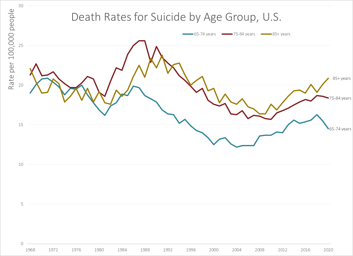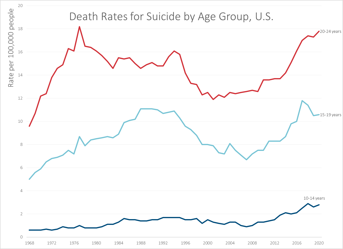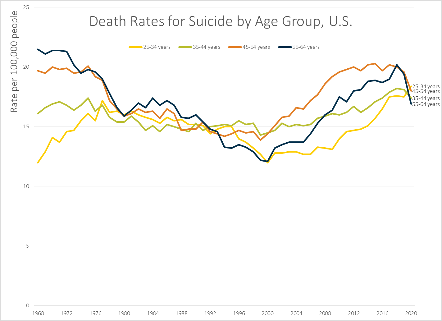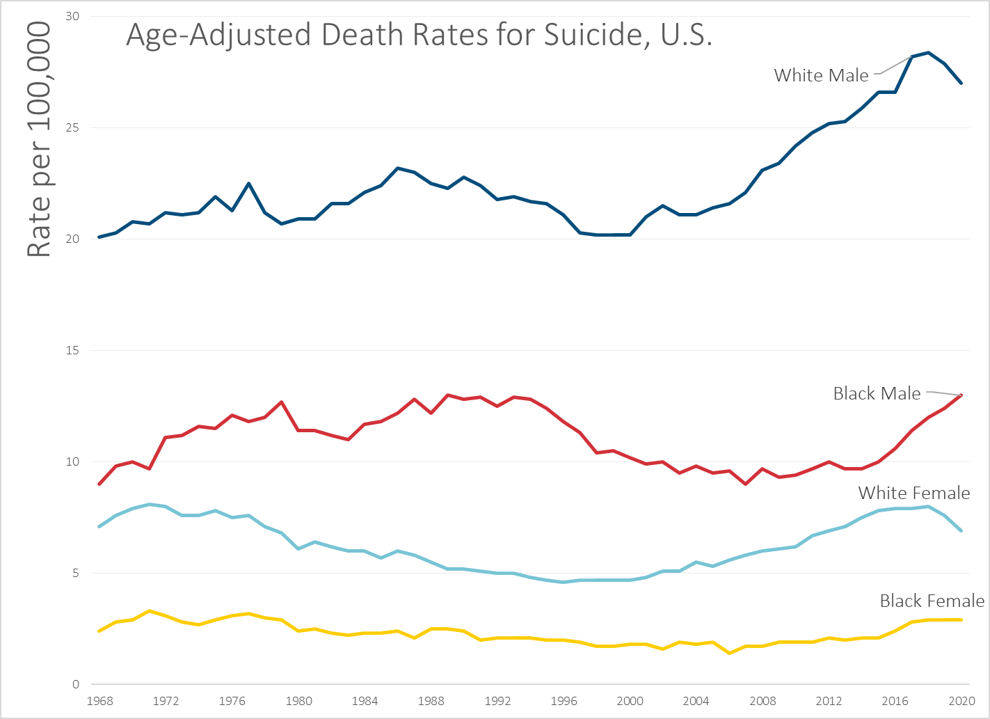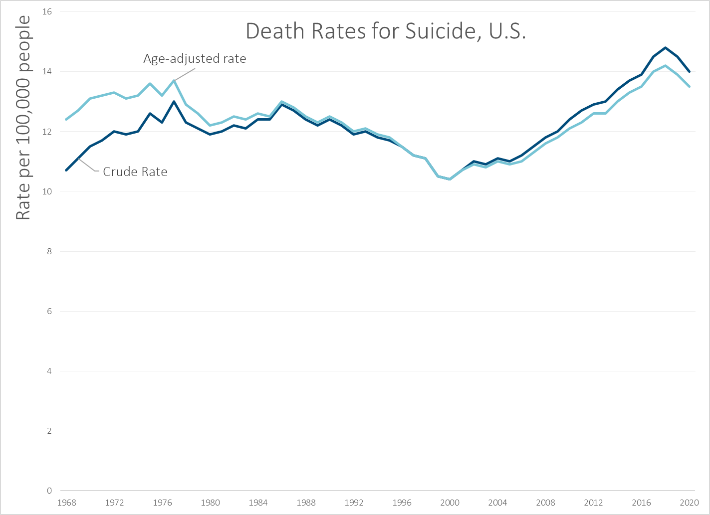 Asking in full ignorance (redundant from me, I know): has the coding of suicide as CoD been evolving to where people are more willing to have it listed (or the official is not trying to shield a family from some perceived stigma)? Or has it been free of shenanigans? Impossible to tell, but if there was a time when it wasn’t listed out of consideration for something but now is more accurately captured, it would show increase even if rates remained the same.