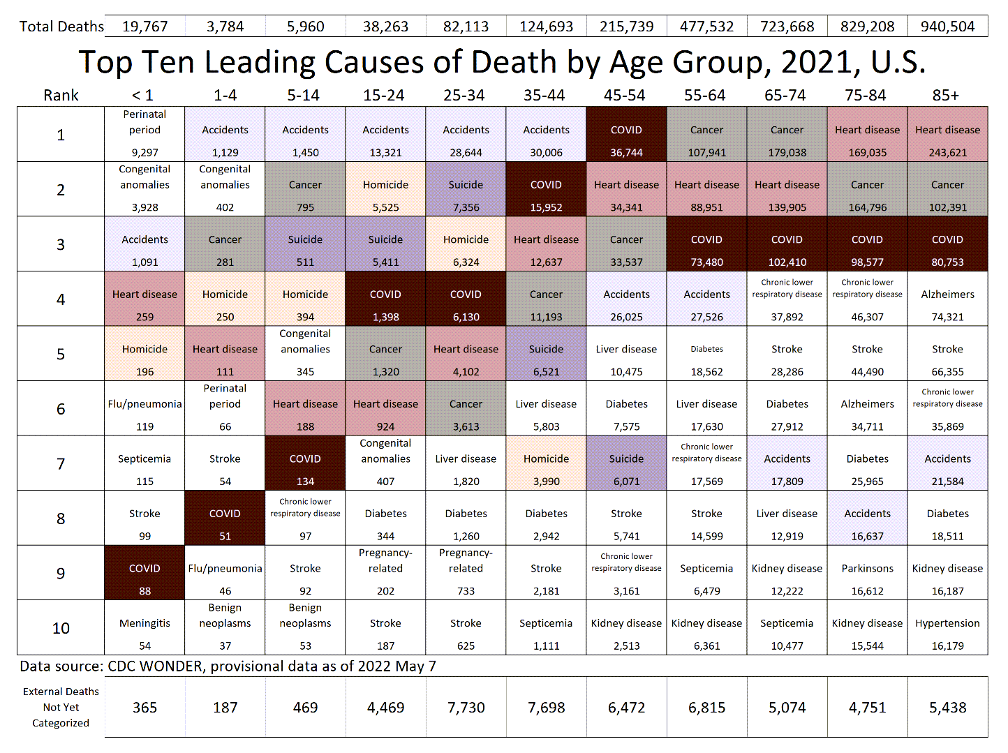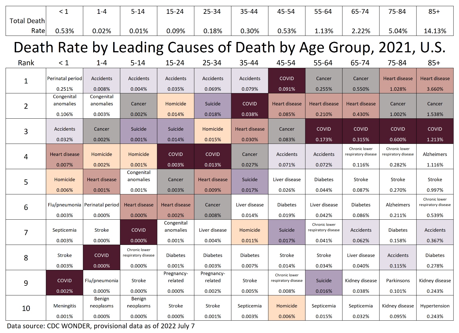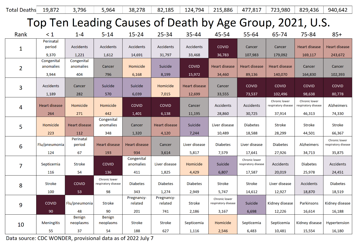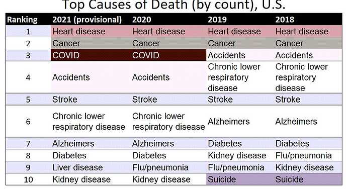 The top causes of death for U.S. in 2021 are essentially the same overall, just switches starting at #9